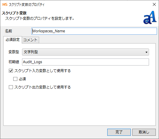 スクリプト変数のプロパティダイアログの初期値を、保管先に指定するワークスペース名に変更します。