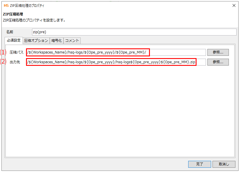初期値には/${Workspaces_Name}/hsq-logs/${Ope_pre_yyyy}/${Ope_pre_MM}/が入力されています。ワークスペースAudit_Logsの前月分のログが含まれるディレクトリーを圧縮しています。