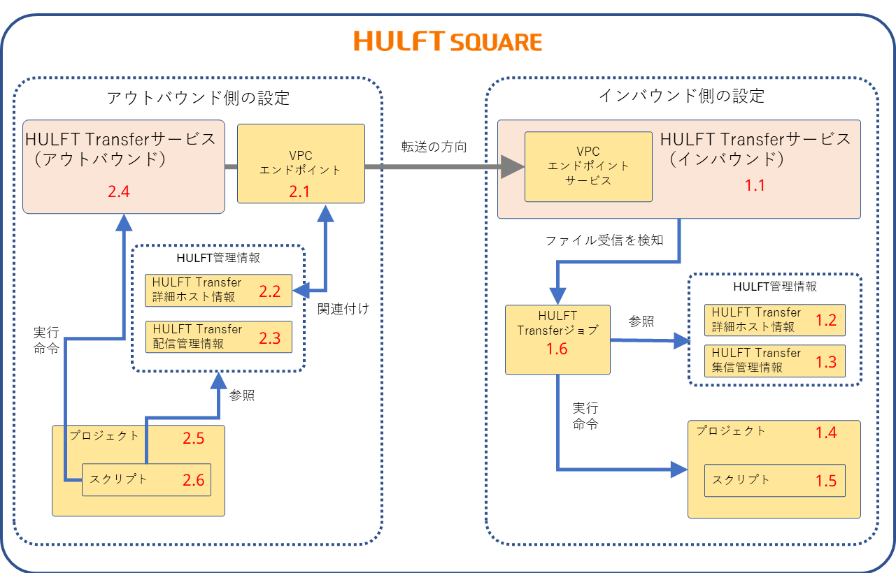 配信の命令を受け取ったHULFT Transferサービスは、HULFT管理情報を元に、VPCエンドポイントにファイルを配信します。