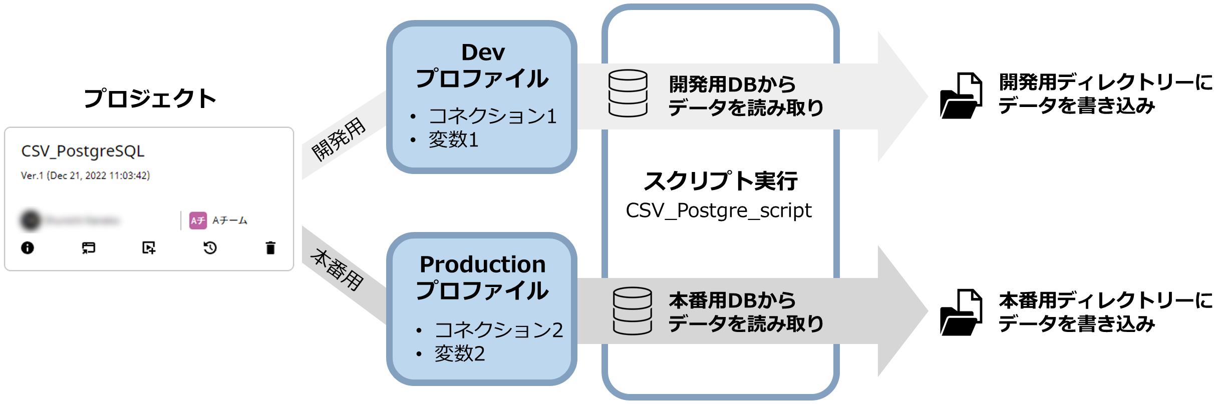 リソースにプロファイルを設定することにより、スクリプトを編集することなくデータベースなどの接続先を切り替えたり、データの出力先のストレージを切り替えたりできます。