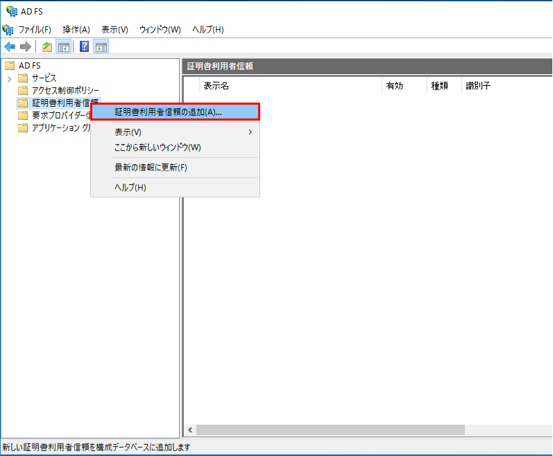 コンソールツリーのAD FSで、証明書利用者信頼を右クリックして、証明書利用者信頼の追加...を選択します。