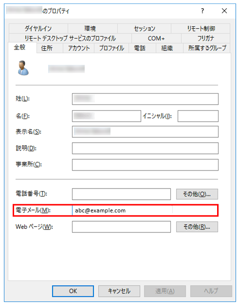 このため、Active Directoryユーザーの以下のプロパティ設定画面で、全般タブの電子メールにメールアドレスを必ず設定してください。
