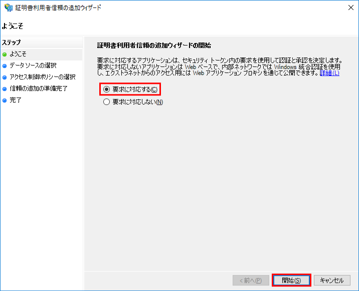証明書利用者信頼の追加ウィザード画面のようこそのステップで要求に対応するを設定し、開始を選択します。