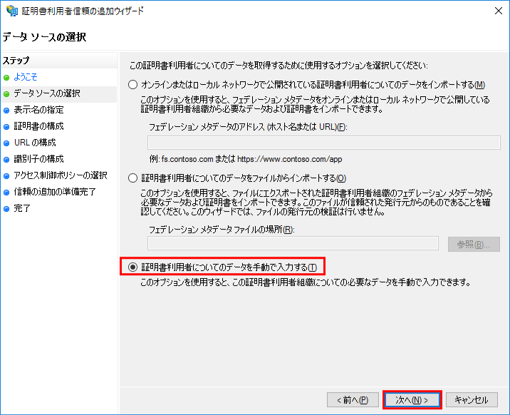 データソースの選択のステップで証明書利用者についてのデータを手動で入力するを設定し、次へを選択します。