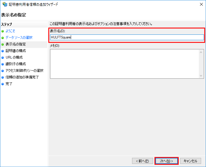 表示名の指定のステップで表示名にHULFTSquareを設定し、次へを選択します。