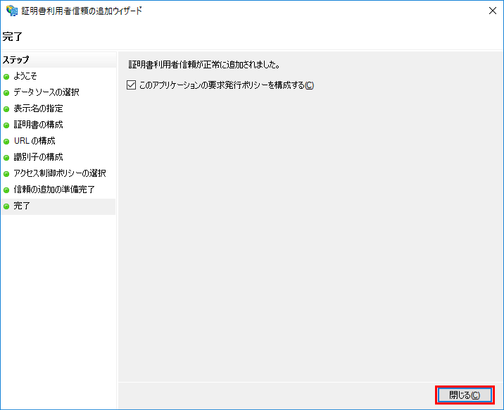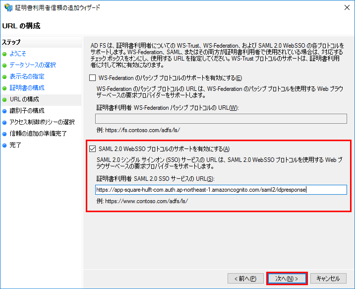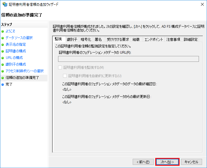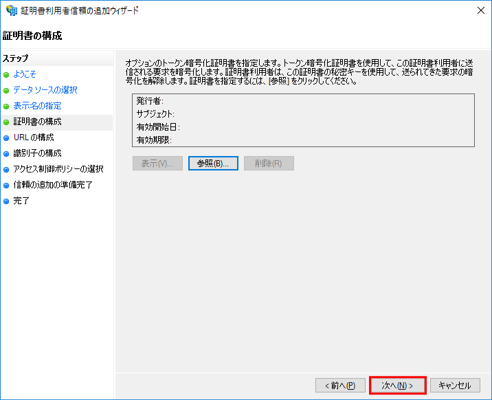 証明書利用者信頼の識別子リストに設定した値が表示されます。次へを選択します。