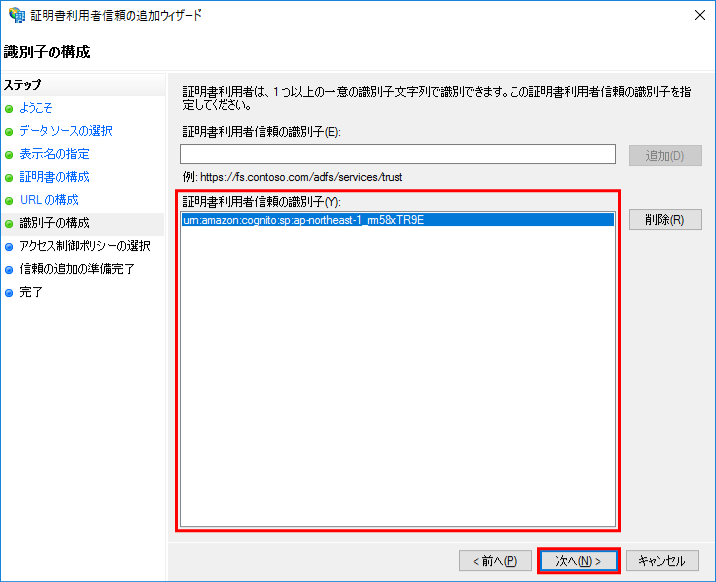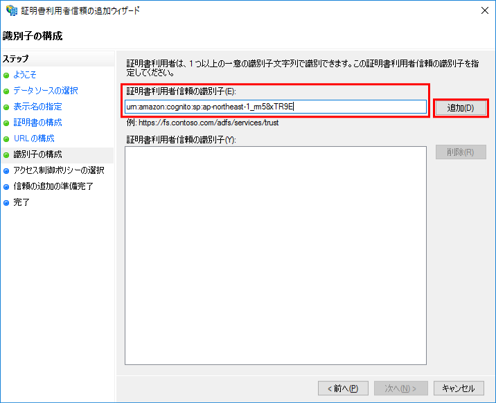 識別子の構成のステップでurn:amazon:cognito:sp:ap-northeast-1_rm58xTR9Eを設定し、追加を選択します。