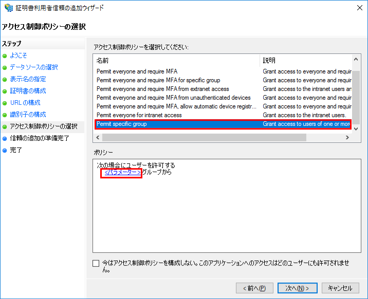 アクセス制御ポリシーの選択のステップでPermit specific groupを設定し、<パラメーター>のリンクを選択します。