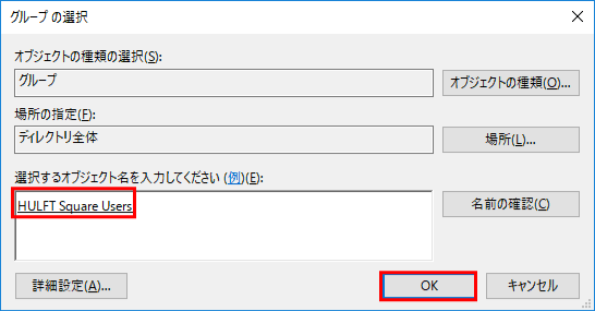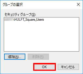 セキュリティグループに<ドメイン名>\HULFT_Square_Usersが表示されたことを確認し、OKを選択します。