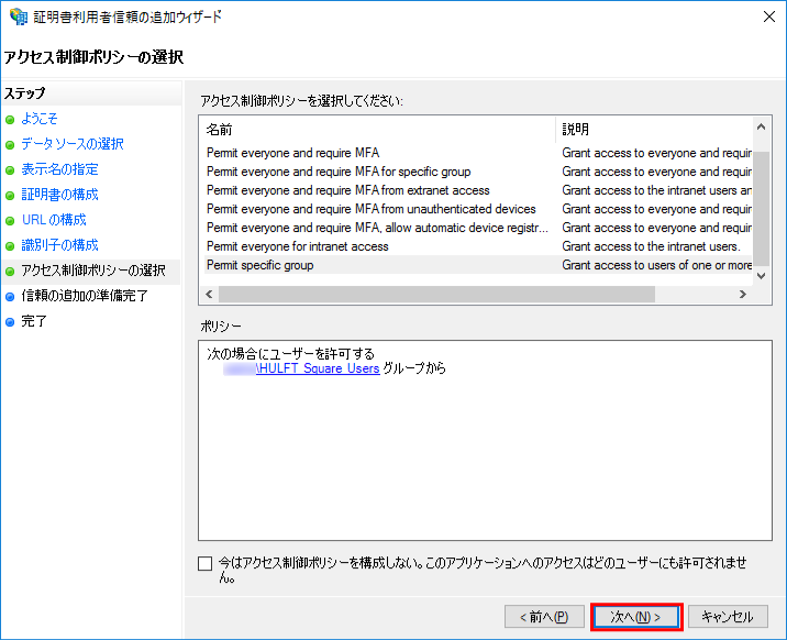 アクセス制御ポリシーの選択のステップの設定が完了したら、次へを選択します。