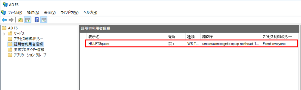 ADFSとHULFT Squareを接続するために、証明書利用者信頼を設定します。