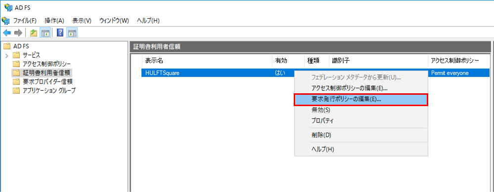 証明書利用者信頼のリストから、HULFTSquareを右クリックして、要求発行ポリシーの編集...を選択します。