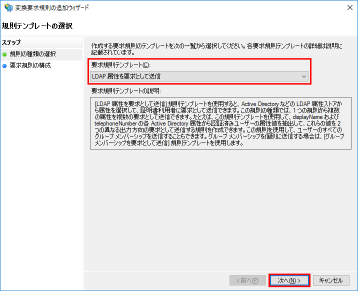 規則の種類の選択のステップで要求規則テンプレートにLDAP属性を要求として送信を設定し、次へを選択します。