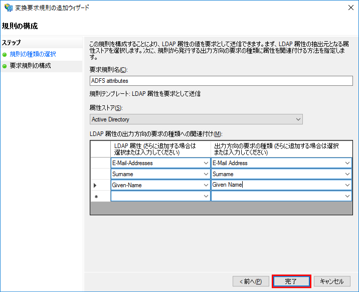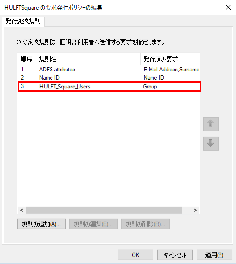 ADFSからHULFT SquareにLDAP属性のメール、姓および名を送るために、要求発行ポリシーを設定します。