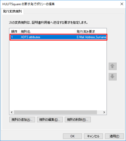 発行変換規則タブに「ADFS attributes」という名前の規則が追加されます。