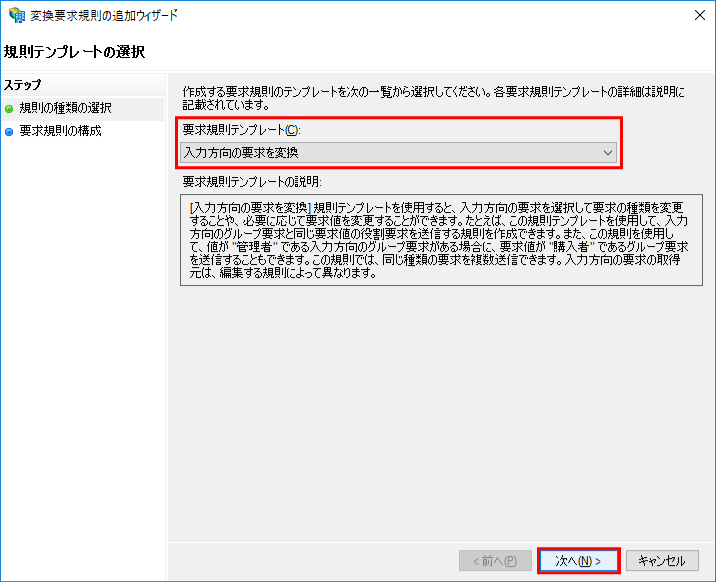 規則の種類の選択のステップで要求規則テンプレートに入力方向の要求を変換を設定し、次へを選択します。
