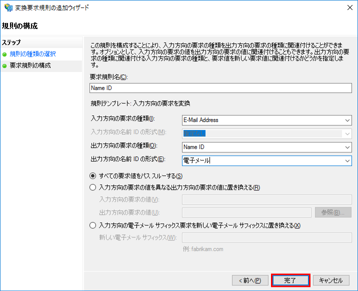 要求規則の構成のステップで以下に示すように項目を設定し完了、を選択します。