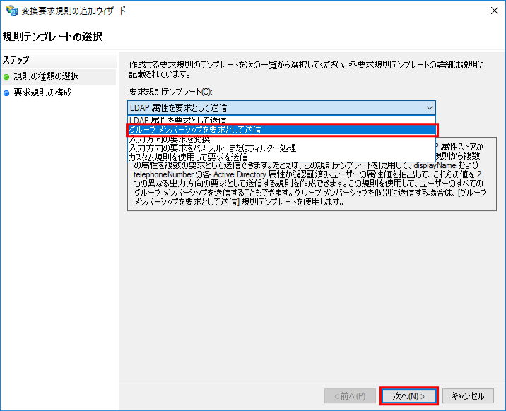 規則の種類の選択のステップで要求規則テンプレートにグループメンバーシップを要求として送信を設定し、次へを選択します。