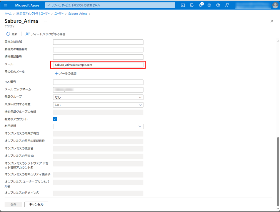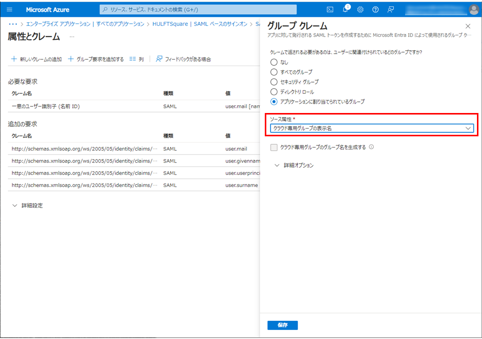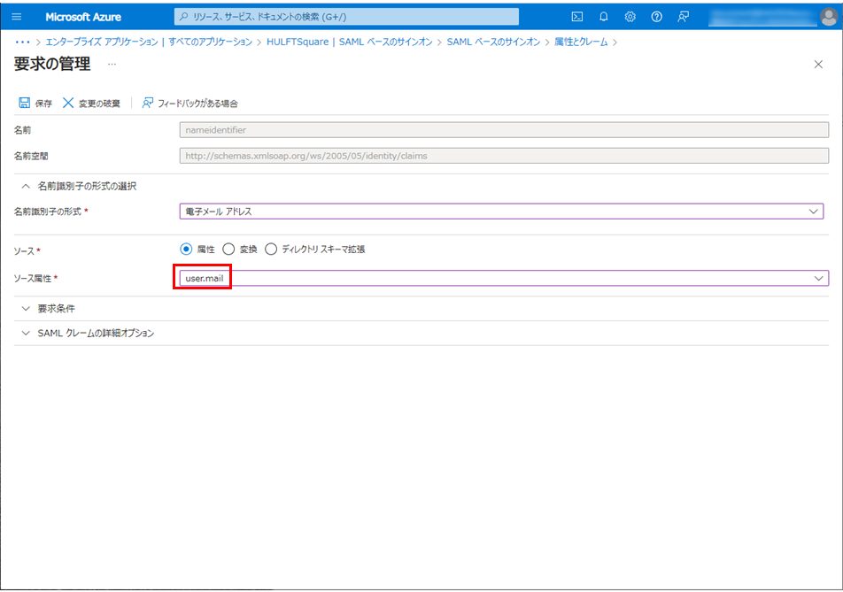 ソース属性の設定値が「user.mail」ではない場合、「user.mail」に変更して保存を選択します。