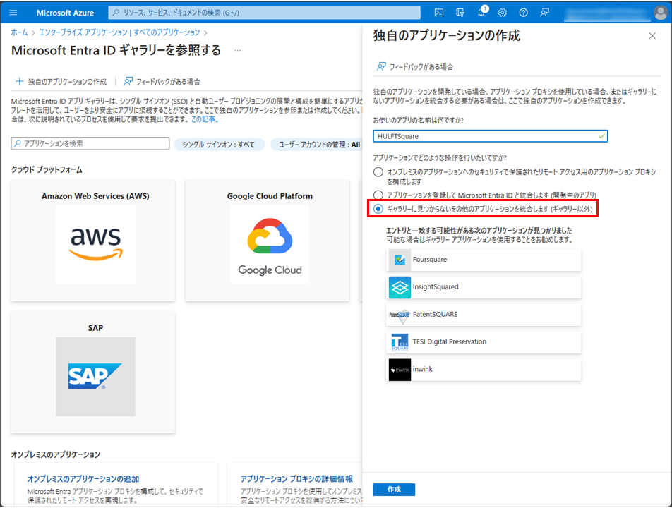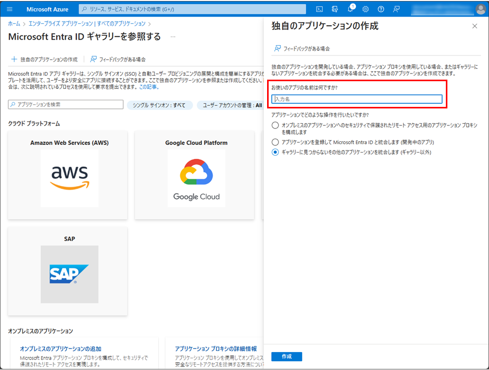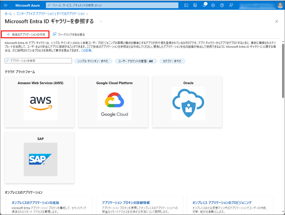 Microsoft Entra IDギャラリーの参照メニューの上部にある独自のアプリケーションの作成を選択します。