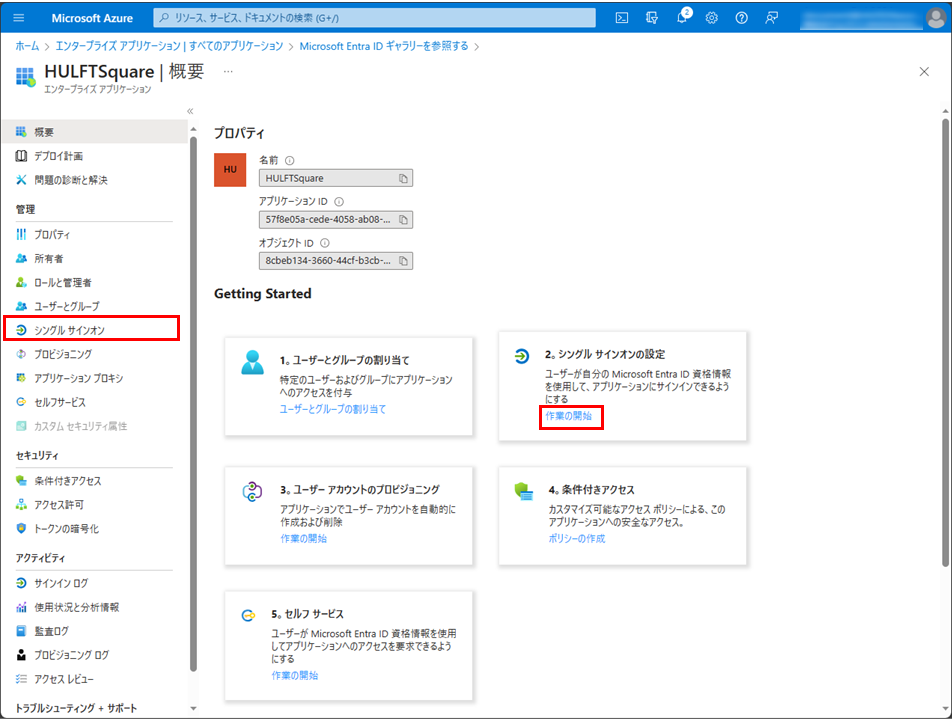 = 備考 =概要 > Getting Startedから、2.シングルサインオンの設定にある作業の開始を選択しても遷移できます。