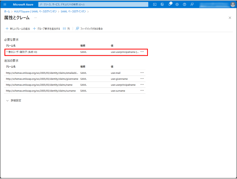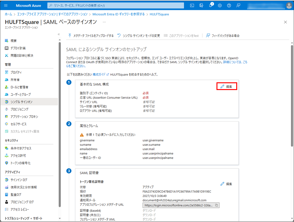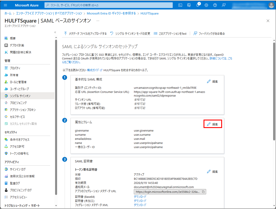 SAMLによるシングル サインオンのセットアップページで、属性とクレームの編集を選択します。