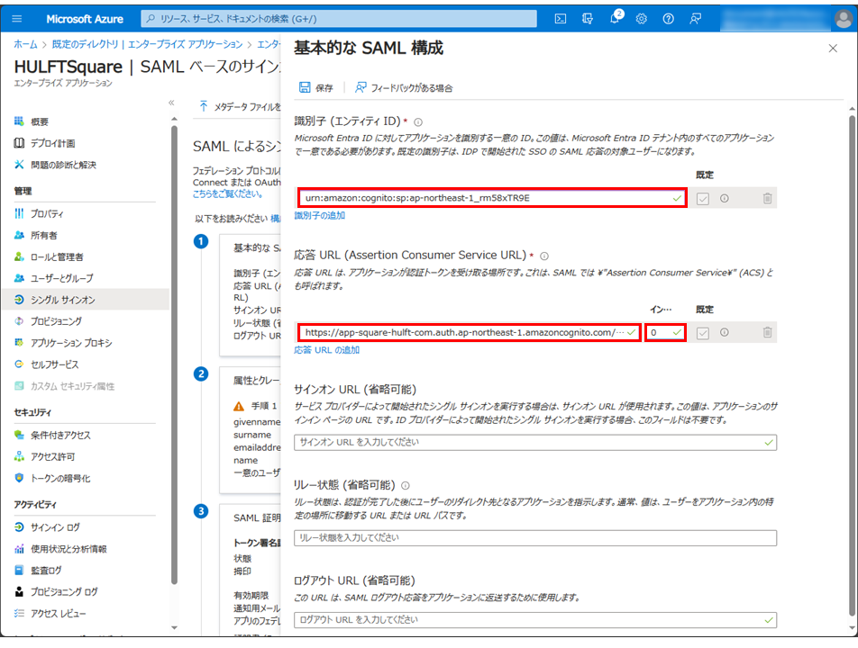 基本的なSAML構成セクションで、以下の項目を設定します。