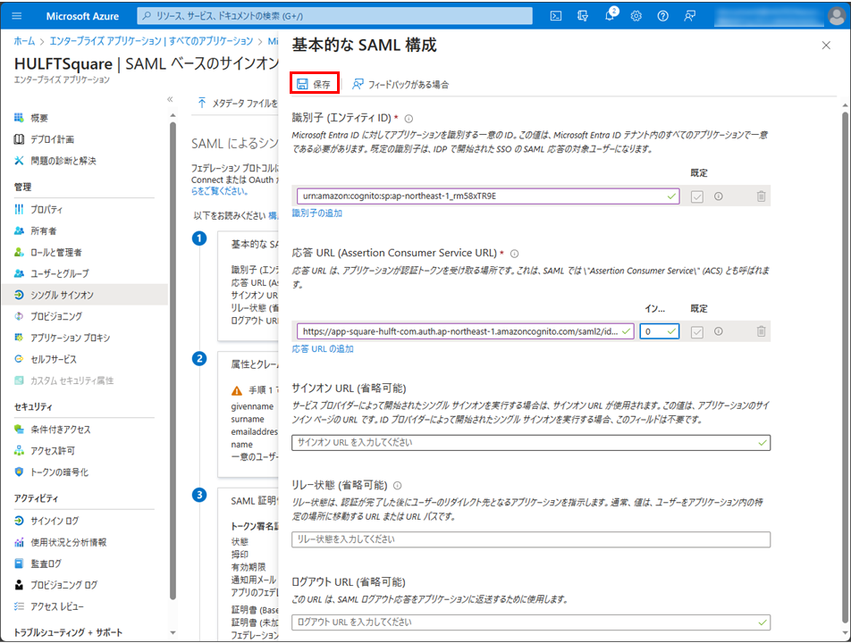 (3)(2)で作成したアプリケーションにSAMLによるシングルサインオンを設定する
