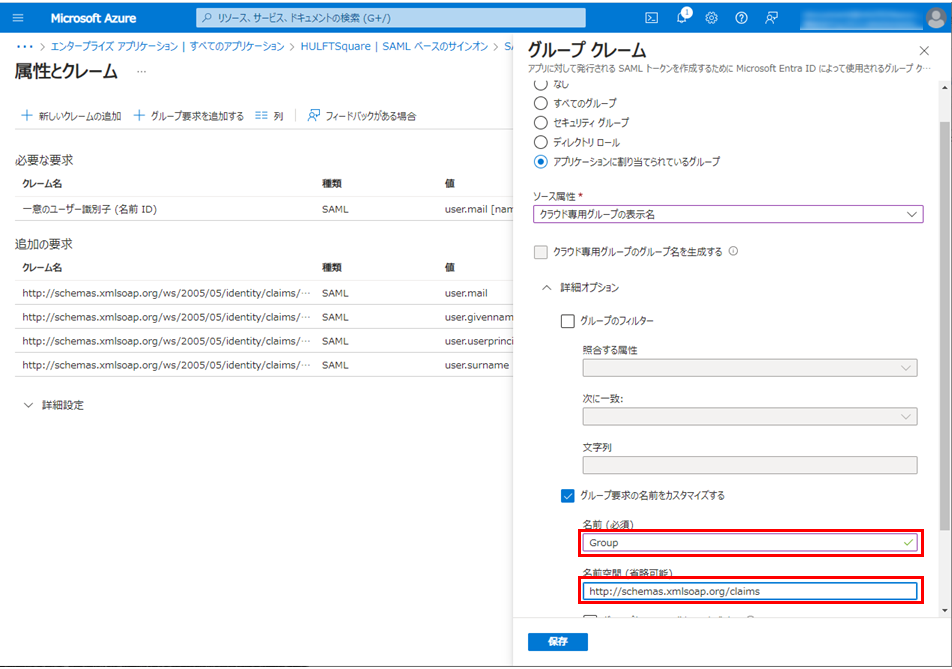 詳細オプションを開き、グループ要求の名前をカスタマイズするを選択し、以下の内容を入力します。
