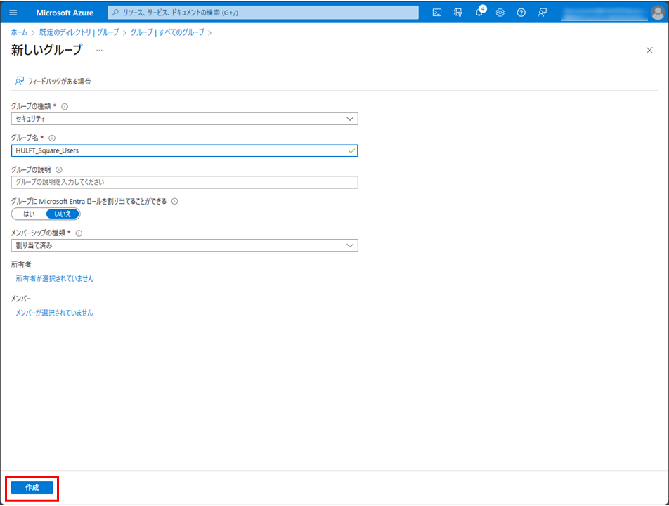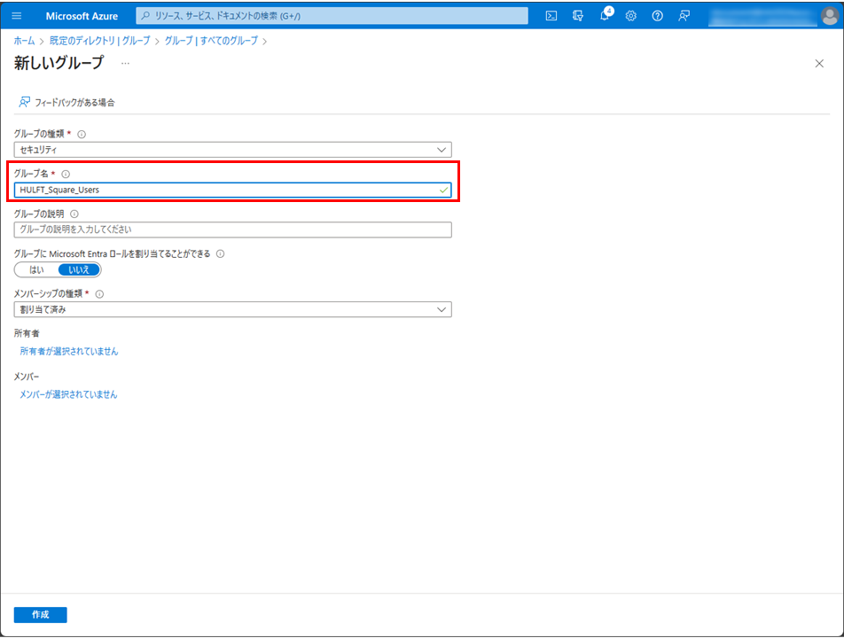 HULFT Square上のグループ名とMicrosoft Entra ID上のグループ名は一致している必要があります。事前にHULFT Squareでグループを作成し、同名のグループをMicrosoft Entra ID上で作成することをお勧めします。