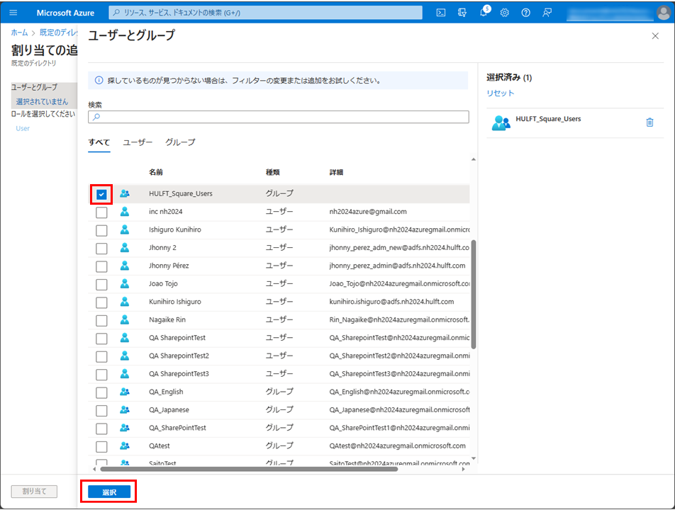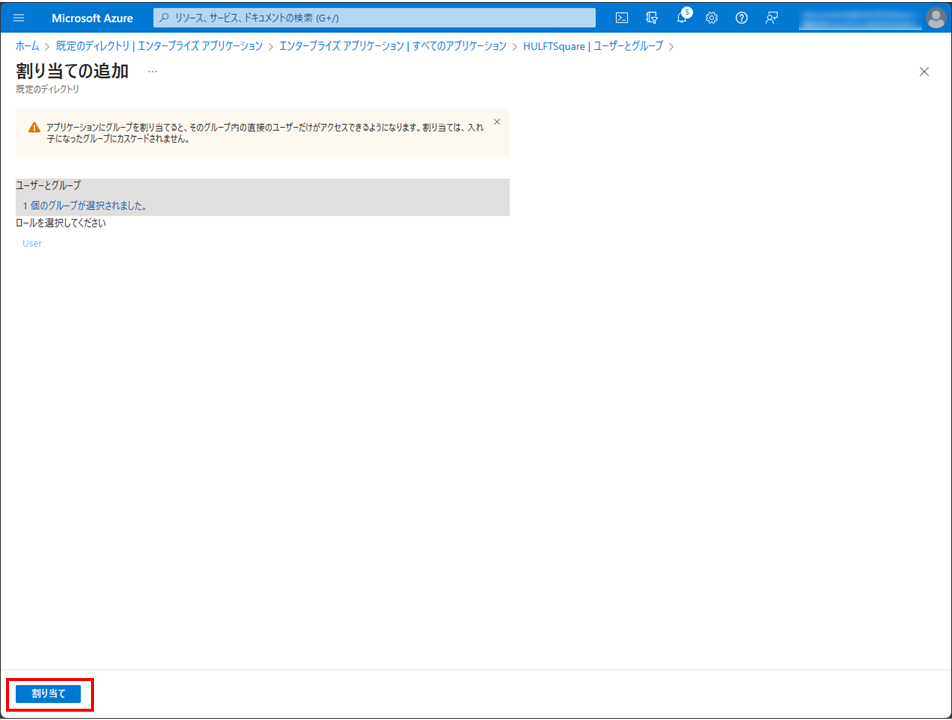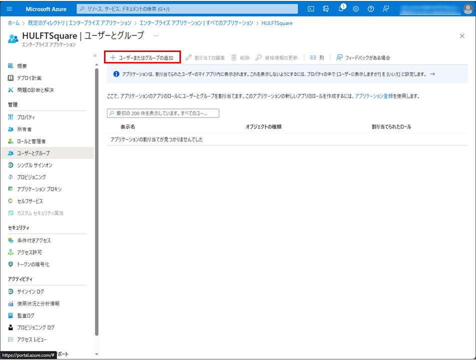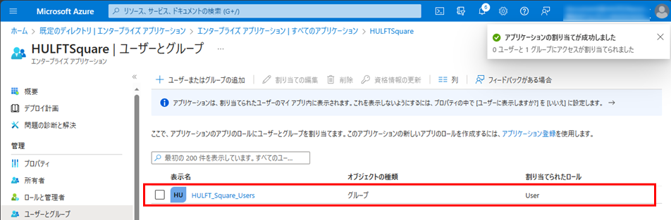 = 備考 =エンタープライズアプリケーションにグループの割り当てを行わない場合、SSO経由でユーザーが追加されたときにHULFT Square上でどのグループにも属していないユーザーとなります。そのため、管理者が手動で適切なグループを割り当ててください。