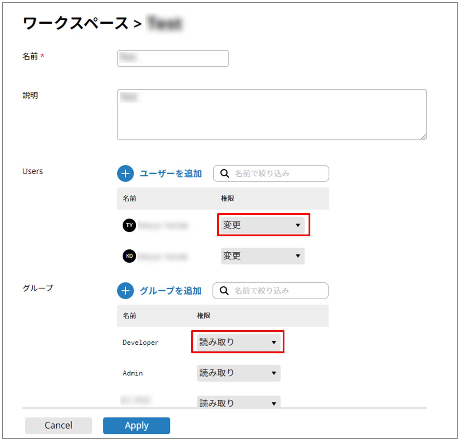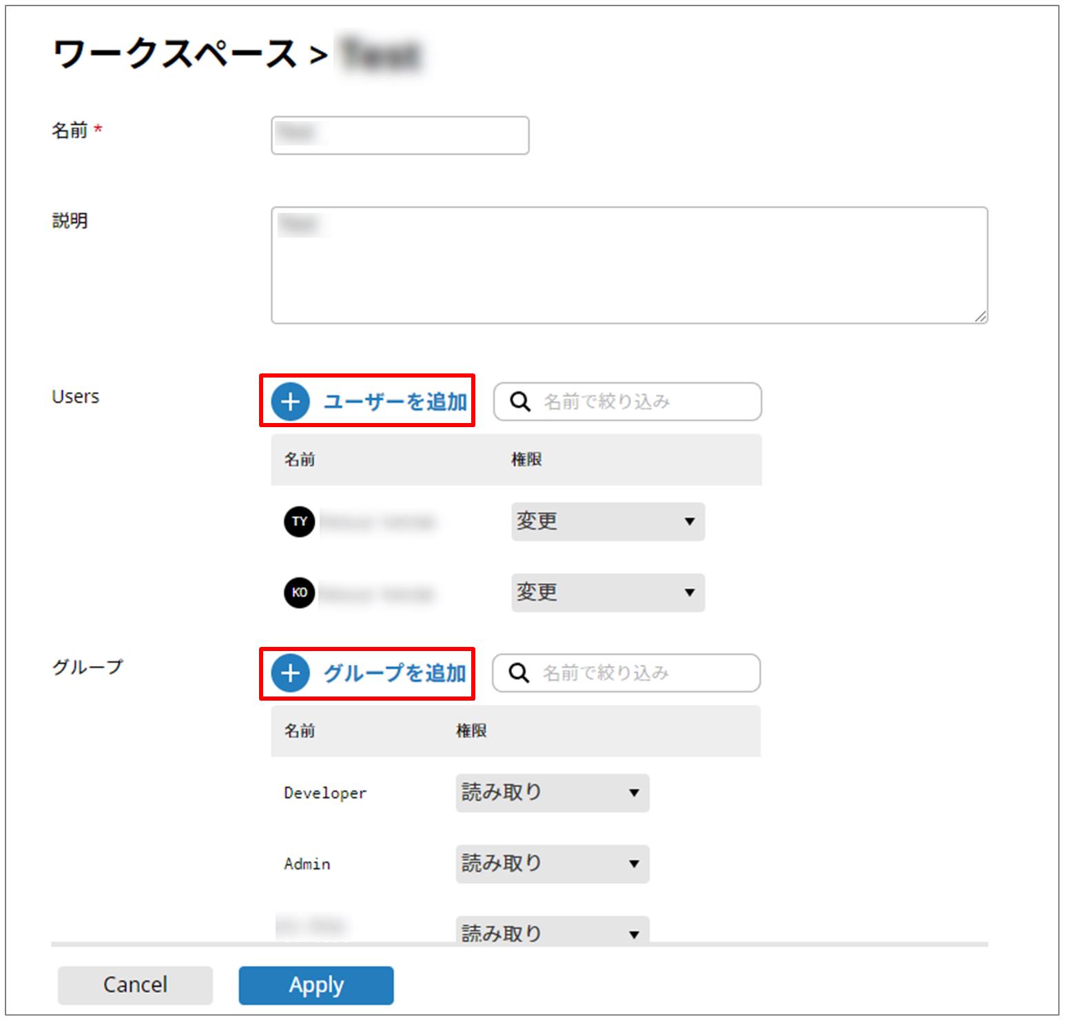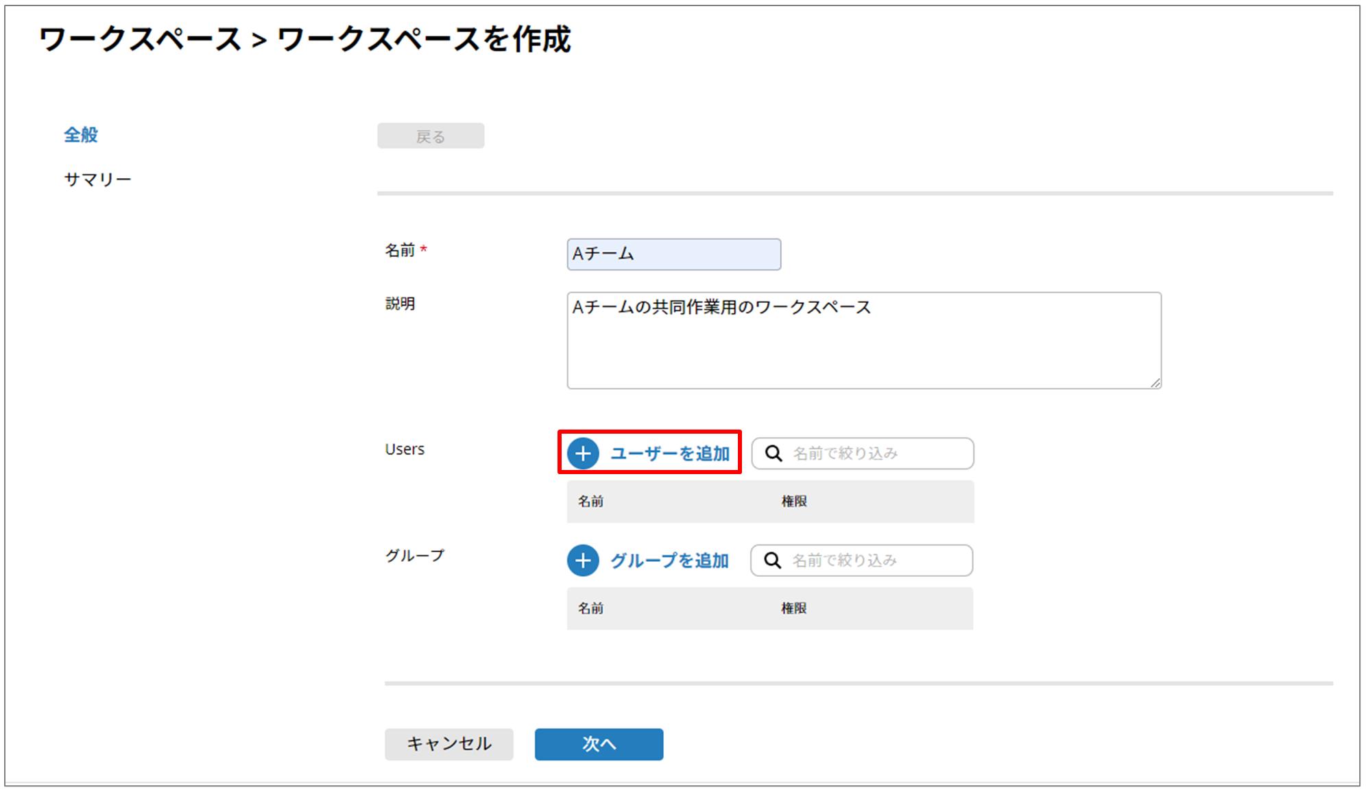 2. 「ワークスペースを作成する」の手順5. を参考にユーザーまたはグループを追加します。
