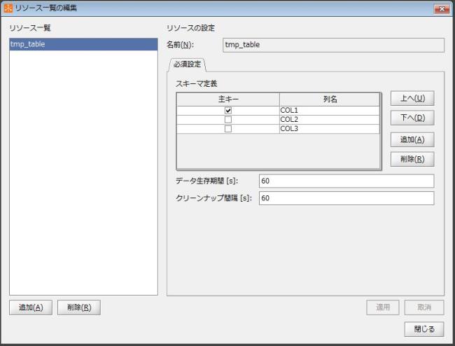 テンポラリテーブルのリソース一覧の編集画面では、登録したテンポラリテーブルの設定の変更を行います。