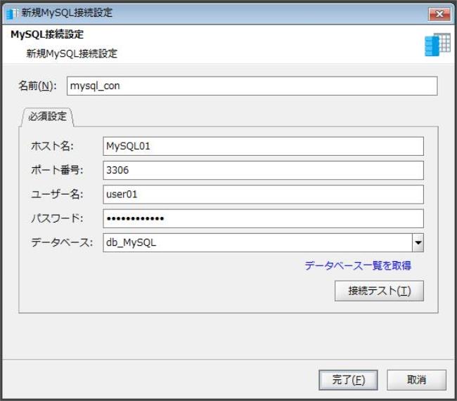 接続テストボタンをクリックすると、データベースに指定したデータベースに接続できるかどうかを確認できます。
