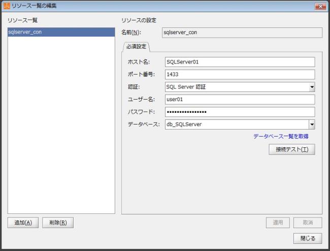 追加ボタンをクリックすると、SQL Server接続設定画面が表示され、リソース情報を追加できます。
