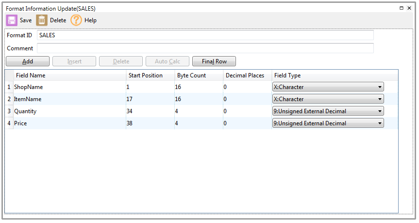 Branch name (16 bytes) | Product name (16 bytes) | Quantity (4 bytes) | Unit price (4 bytes) |