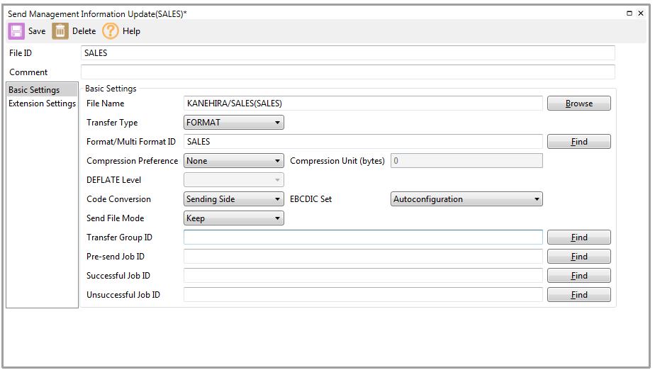 2. In Send Management Information, for Transfer Type, specify FORMAT. For Format/Multi Format ID, specify the Format ID you created.