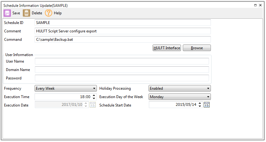 By using HULFT Script commands in a batch, you can automatically back up the server information according to a schedule.