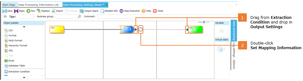 7. Complete the data processing information, and execute processing. If the data output is the same as in the processing diagram, the processing was successful.