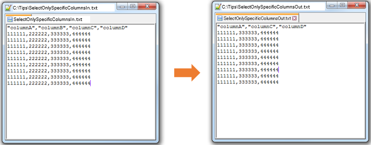For example, if you have columns A, B, C, and D before processing, as shown in the following data, you can change that to only columns A, C, and D.