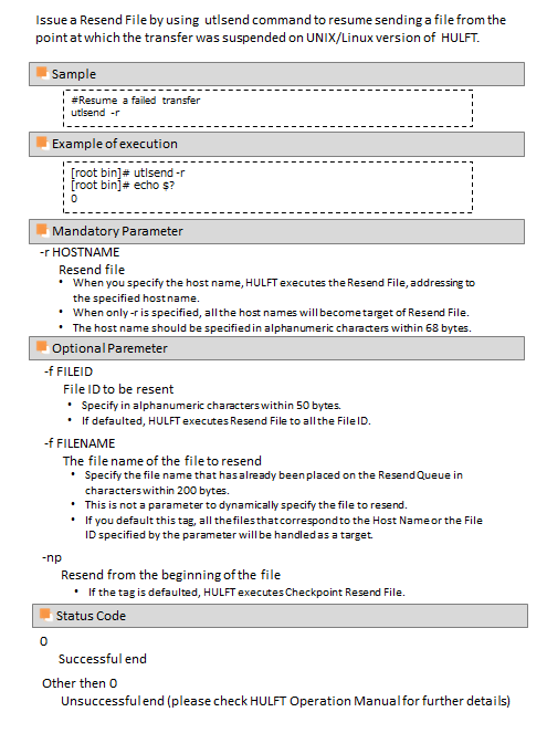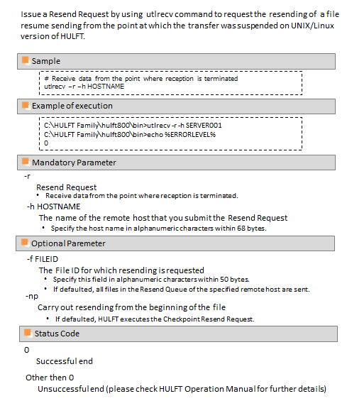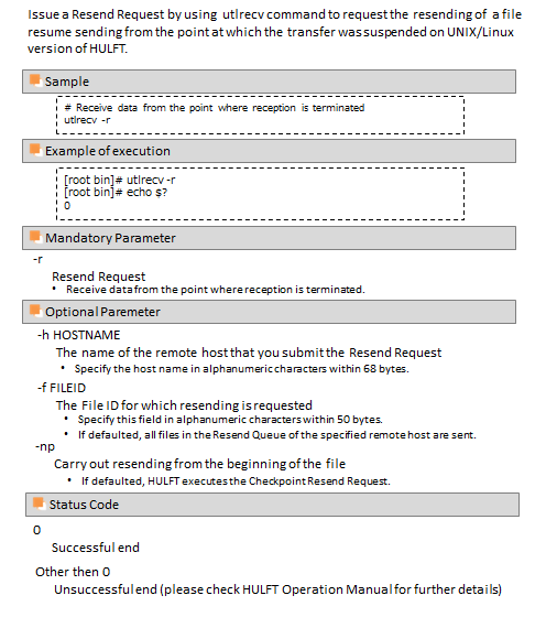 You can use the utlrecv command to request the resending of a file resume sending from the point at which the transfer was suspended.