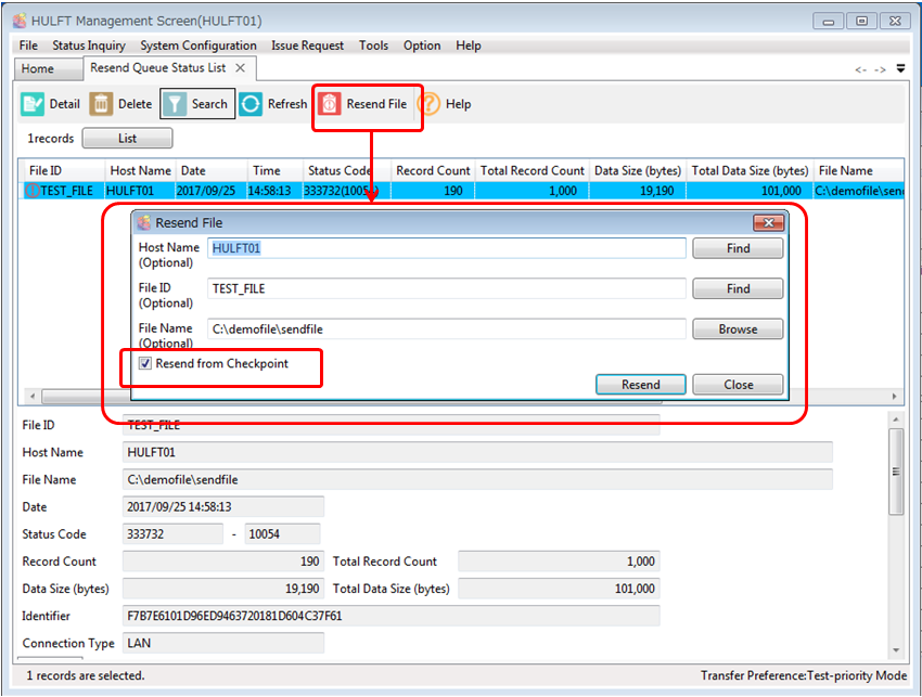 Because you can select the file ID from a list, this method is convenient when you want to specify a host name, file ID, or file name for the transfer you want to resend.