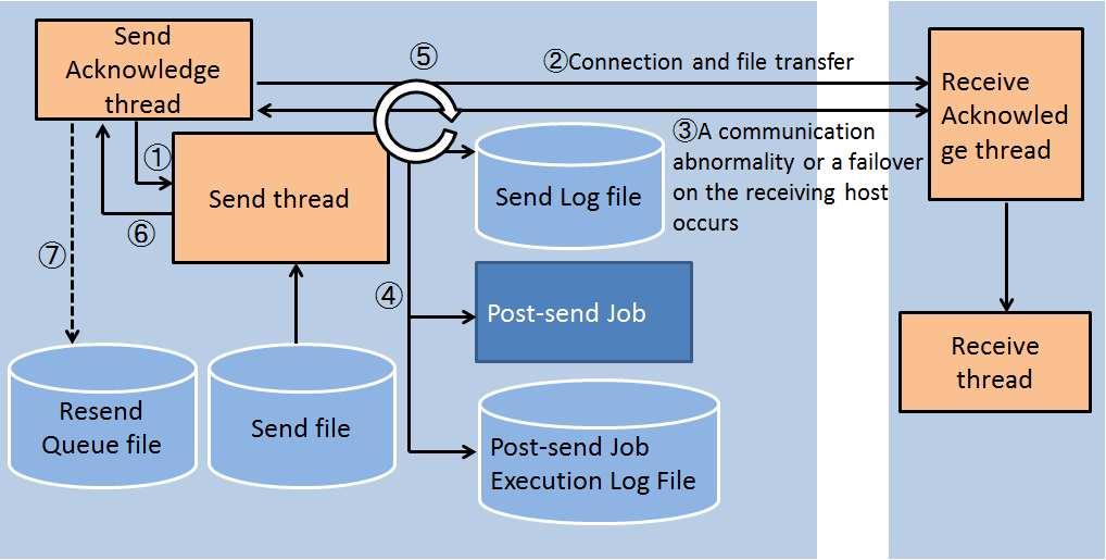 If an attempt to send a file is suspended because of a network error (for example, if the HULFT receive process on the other host stops, or if the socket is disconnected), the send thread waits for the period of time specified for Connect Retry Interval in the System Environment Settings.