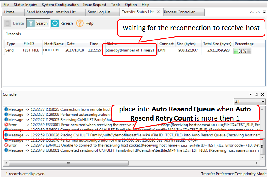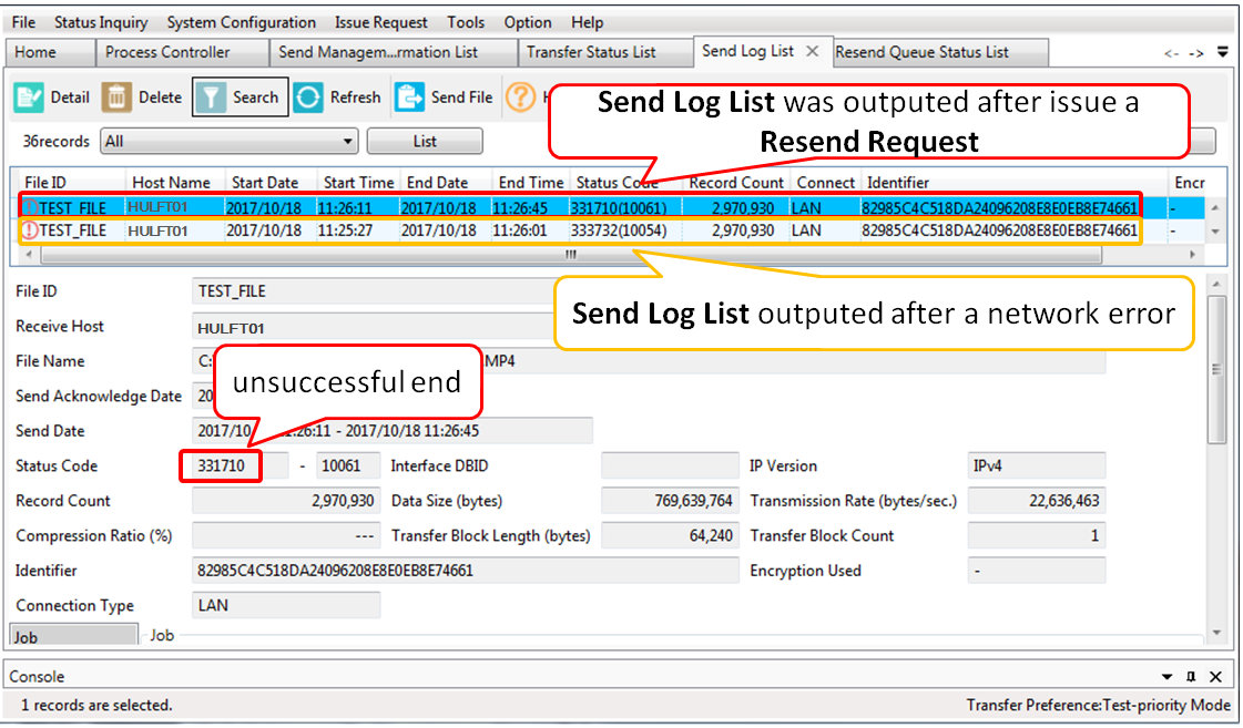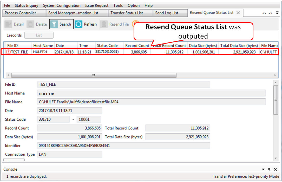 The send process ends abnormally, and information about the resend (Resend Queue Status List) was outputed.