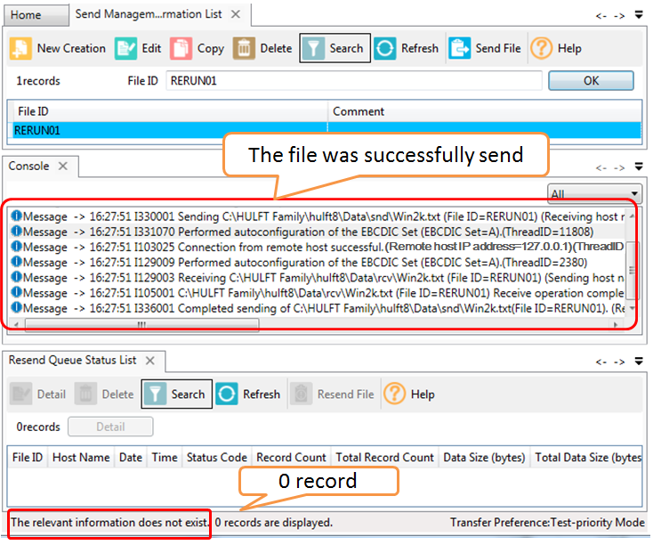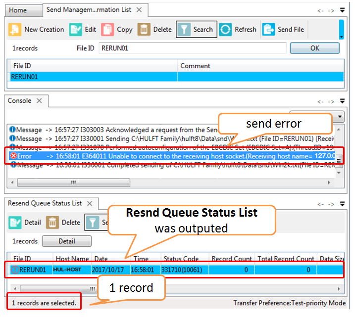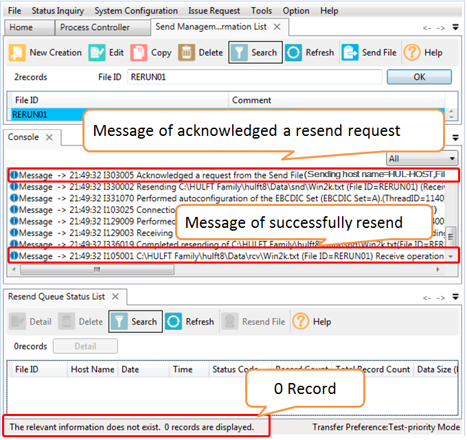 As you can see, when Receive Ready Notification in the System Environment Settings is set to On, even when a transfer fails because the other host is stopped, you can detect when the host starts and automatically resend files at that time.