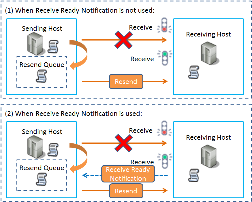 However, if you set up Receive Ready Notification, which I will introduce in this tip, the receiving host automatically notifies the sending host when the receive process starts, as shown in diagram (2). When you use this function, the file is resent automatically, even if you don't manually resend it.