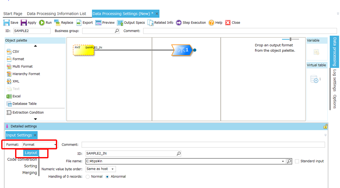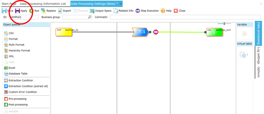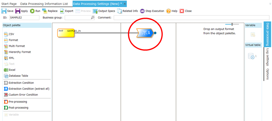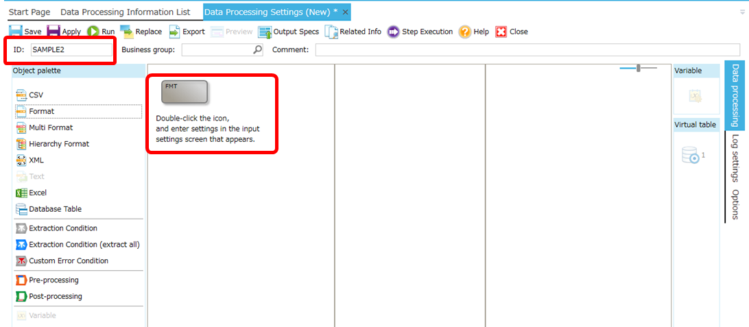 - Enter the data processing settings ID that you want to use, and then double-click the input file icon.