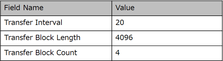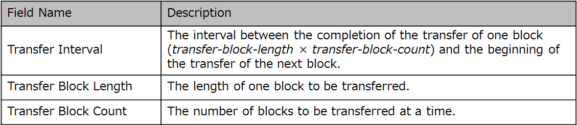 Example: If you specify 4096 for Transfer Block Length, 3 for Transfer Block Count, and 1000 for Transfer Interval, 12288 bytes of data will be transferred at a time, at intervals of 1000 milliseconds.