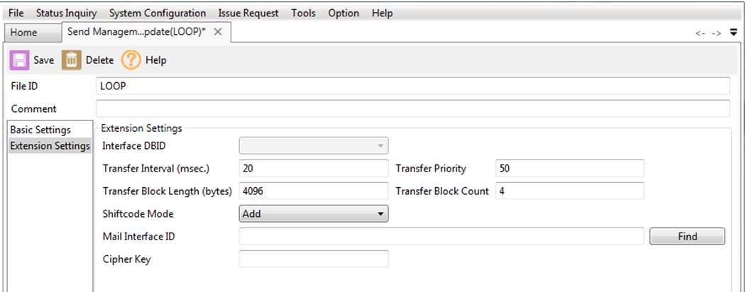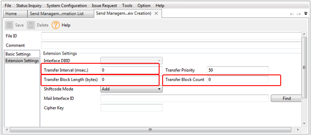 The following three settings, located in Extension Settings in the Send Management Information, can be used to specify a Transfer Interval in HULFT.
