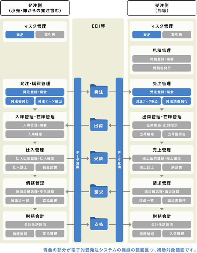 - 原則、既にEDI/EOS等の電子的受発注を利用している事業者が対象となります。ただし、電子的受発注システムは利用していないが、取引先の要請等により、新規にシステムを導入する場合は補助対象となります。